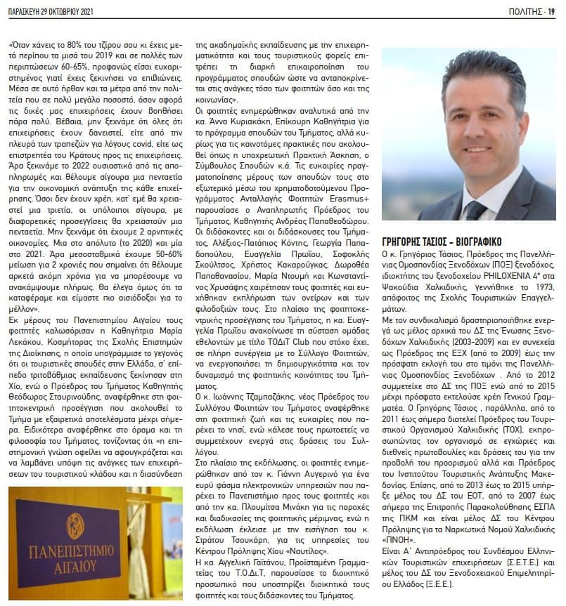 Τη Δευτέρα, 15/11/2021 στις 15:00, στο Μιχάλειο Κτίριου του Πανεπιστημίου Αιγαίου, το Τμήμα Οικονομικής και Διοίκησης Τουρισμού, διοργάνωσε εκδήλωση με θέμα: «Το κρασί στις επιχειρήσεις φιλοξενίας» με προσκεκλημένους ομιλητές τους κ.κ. Κωνσταντίνο Στεφανακίδη, Στέλεχος της Διεύθυνσης Τουριστικής Εκπαίδευσης & Κατάρτισης του Υπουργείου Τουρισμού, ειδικό σε θέματα φιλοξενίας και επισιτισμού, τον κ. Παναγιώτη Κεφάλα, Υπεύθυνο Πωλήσεων & Προμηθειών της ΑΡΙΟΥΣΙΟΣ Α.Ε. και την κ. Άννα Λαγού, Υπεύθυνη Δημοσίων Σχέσεων της εταιρείας.